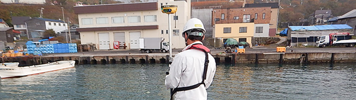 沖合いの防波堤などに水準点(渡海)を設置する為の作業で、基準となる高さを付与し、現況調査や沈下計測における与点として使用します。